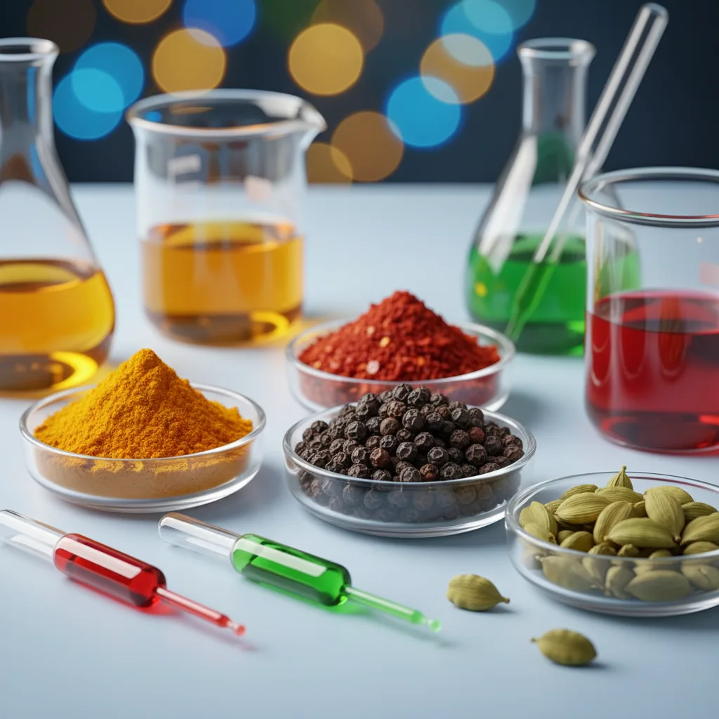 Volatile oil content (for Black Pepper and Cardamom), Curcumin levels (for Turmeric), and Capsaicin levels (for Red Chillies).
